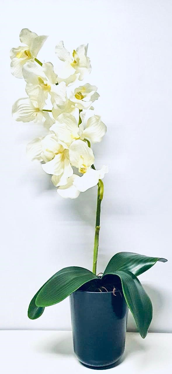 Arreglo Orquídea Artificial Premium, en jarrón biodegradable, decorada con piedras de rio.